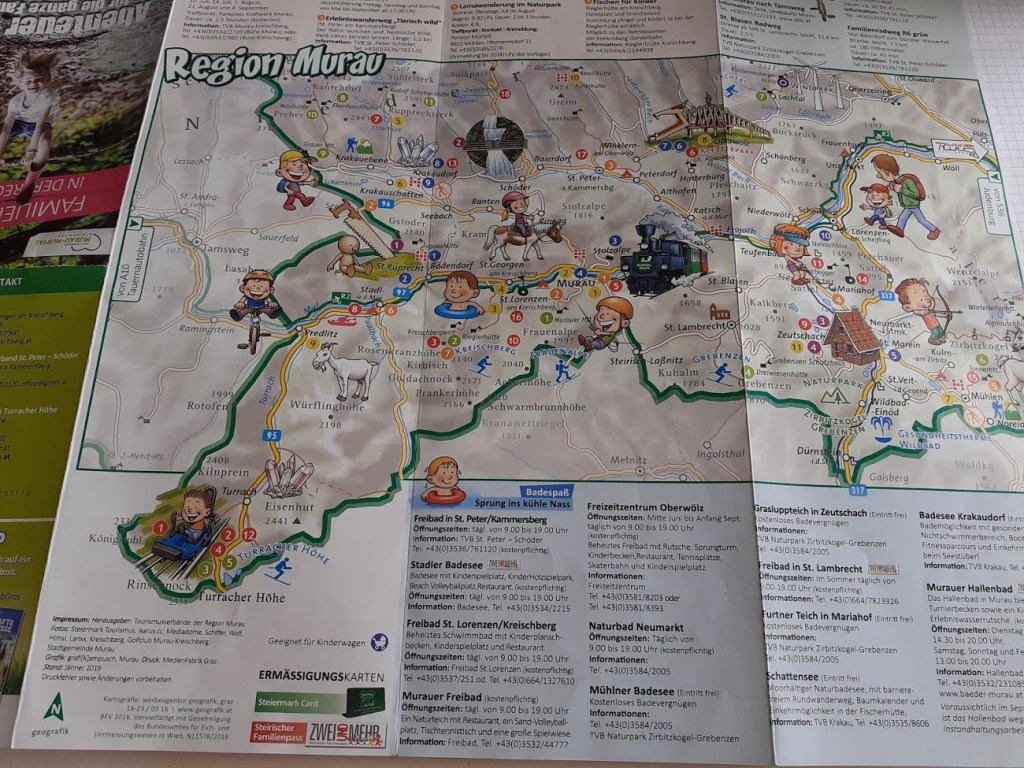 Bevallom ez inkább olyan sodródós út volt, mint jól megtervezett. Egyrészt jártunk már a régióban, így a környék ismert volt, másrészt az osztrák turisztikai kiadványokhoz hasonlóval még egy országban sem találkoztam, így tudtam, hogy helyben is pillanatok alatt találunk programot majd, ami a gyerekeket szólítja meg és így is volt, inkább a bőség zavara állt fent, de legalább lesz miért ismét visszamenni.