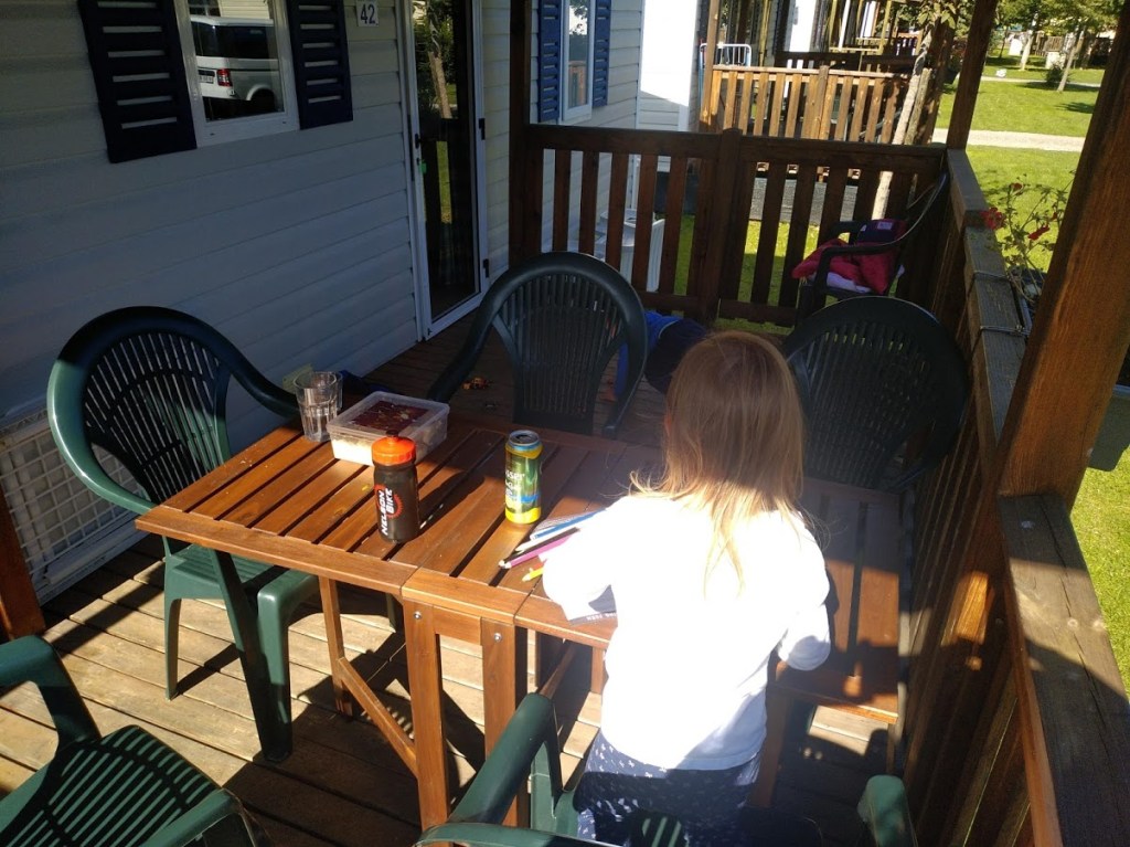 A kempingben már utószezon volt, így a bolt és a medence nem működött, viszont klassz játszótere van, egy mobil épület tele volt könyvekkel, prospektusokkal és játékokkal. A gyerekeket színezőkkel várták. Ezeken kívül volt egy épület, ami pedig közösségi összejövetelekre volt berendezve.